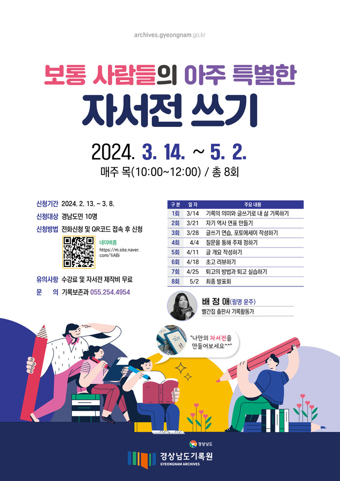 프로그램 참여는 13일부터 3월8일까지 전화 또는 네이버 폼으로 신청할 수 있으며, 강의 세부 과정 등 자세한 사항은 경상남도기록원 홈페이지를 통해 확인할 수 있다.