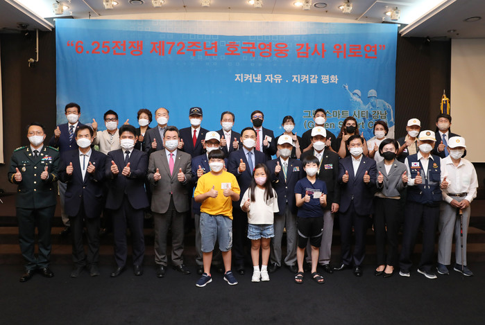 강남구가 최근 대한민국6.25참전유공자회 강남구지회 주관으로 6.25전쟁 제72주년 호국영웅 감사 위로연을 개최하고 모범 국가유공자에게 표창장을 수여하고 새터민 학생 및 UN군 손자·녀들에게 장학금을 전달했다. 사진은 조성명 구청장(둘째줄 가운데)과 참석자들이 기념촬영을 하는 모습. (사진제공=강남구청)
