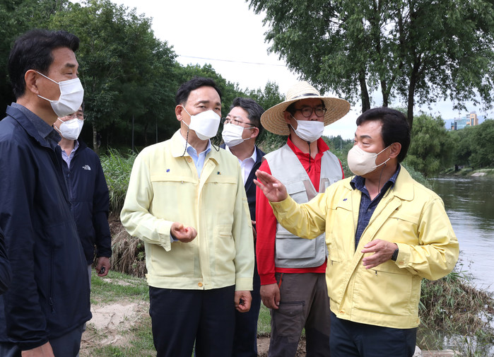 조성명 서울 강남구청장이 민선8기 임기가 시작된 지난 1일 첫 행보로 오전 8시께 세곡동에 위치한 LH강남브리즈힐과 LH강남힐스테이트에서 발생한 토사유입 피해현장을 방문했다. 사진은 피해현장을 살펴보는 조 구청장(왼쪽 세 번째)와 관계자들의 모습. (사진제공=강남구청)