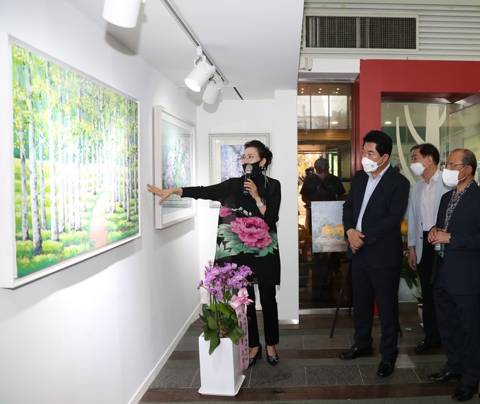 서울 관악구가 오는 15일까지 갤러리관악에서 ‘김자영 작가 개인전’을 열어 유화작품 50점을 선보인다. 김 작가는 현재 한국코파글러벌시티의 정회원으로도 활발한 작품 활동을 펼치고 있다. 사진은 갤러기관악에 방문한 박준희 구청장(왼쪽 두 번째)에게 작품을 설명하는 큐레이터의 모습. (사진제공=관악구청)