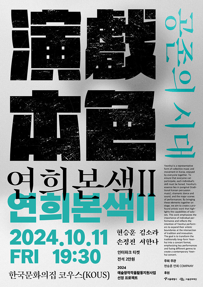 이번 <연희본색 II - 공존의 시대>는 2024 서울문화재단 예술창작작품활동 지원사업에 선정된 프로젝트로, 연희의 본질을 이루는 풍물, 무속의 춤과 소리, 그리고 주요 연주 장면을 집약해 무대화한 공연이다. '공존' 이라는 주제를 통해 장르 간의 결합을 탐구하며 전통 연희의 본질을 현대적으로 재해석하여 솔리스트의 예술적 역량을 부각시키는 데 중점을 두었으며 특히, 풍물과 무속이라는 전통 양식을 융합해 새로운 연희의 형태를 제시한다.