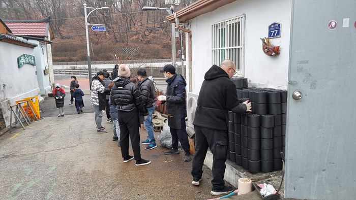 서울 도봉구 도봉1동은 선덕고등학교 총동문회와 함께 최근 도봉산 무수골 저소득 가구 9가구에 2700장의 연탄을 전달하는 ‘연탄나눔 봉사’를 진행했다. 사진은 봉사자들이 저소득 가정에 연탄을 전달하고 있는 모습. (사진=도봉구청 제공)