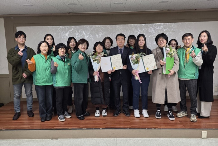 15일 경기 수원시 권선구 서둔동 새마을문고에서는 책을 가장 많이 읽은 문고 이용자를 선정해 ‘다독상 시상식’을 개최했다. 이번 시상식에서는 지난 한 해 동안 많은 책을 읽은 주민 2명이 선정됐다. 사진은 참석자들이 기념촬영을 하고 있는 모습. (사진=권선구청 제공)