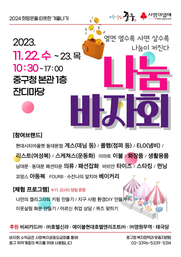 [시민일보 = 여영준 기자] 서울 중구(구청장 김길성)가 오는 22~23일 양일간 구청에서 '나눔 바자회'를 열고 '2024년 희망온돌 따뜻한 겨울나기' 사업의 시작을 알린다.
