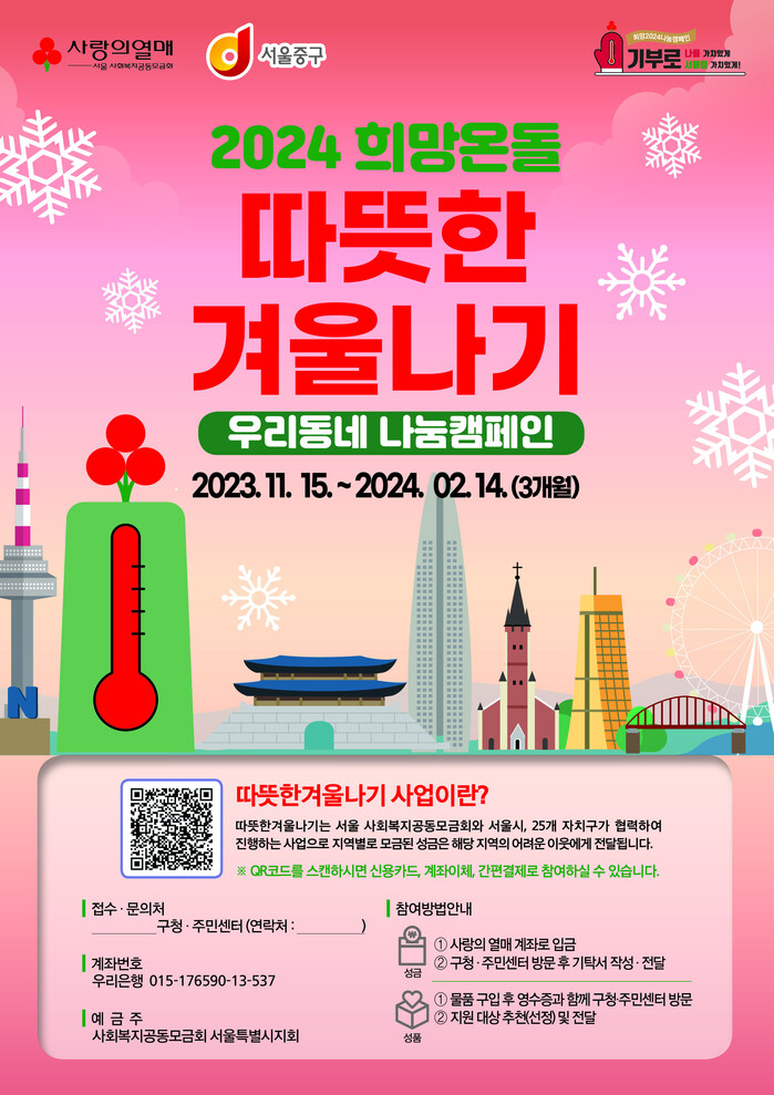 '2024년 희망온돌 따뜻한 겨울나기'는 22일 오전 10시30분 구청 앞 광장에서 김길성 구청장의 선포식 선언으로 막이 오른다. 각 동에서 따뜻한 겨울나기 캠페인을 이끄는 15명의 홍보대사가 나와 이웃돕기 후원에 주민들의 적극적인 동참을 바라는 마음으로 인사를 나눈다. 이어 모금 이벤트가 진행된다.
