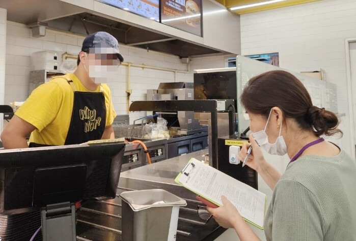 | ▲ 학교 주변 햄버거 판매점을 찾아 위생 점검 중인 동대문구 직원. (사진=동대문구청 제공) |