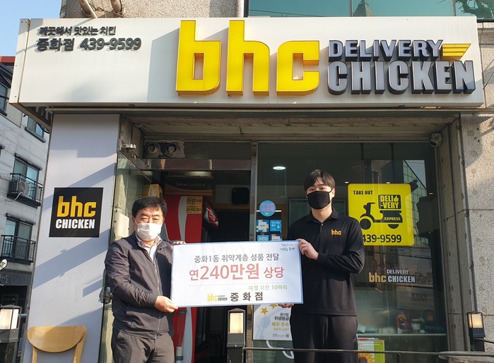 서울 중랑구 중화1동에 위치한 BHC치킨 중화점은 최근 중화지역아동센터에 치킨 10마리를 전달하고, 아동이 있는 취약계층 10가구에 연 240만원 상당의 치킨을 정기 후원하기로 했다. 사진은 오용석 중화1동 주민센터 동장(왼쪽)과 진성 BHC 중화점 대표가 성품전달식에서 기념촬영을 하고 있는 모습. (사진제공=중랑구청)
