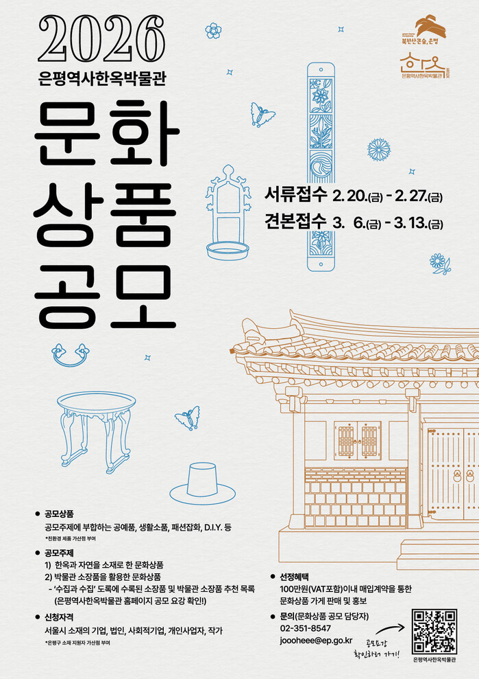 [시민일보 = 이대우 기자] 서울 은평구(구청장 김미경)가 오는 2월20일부터 ‘2026 은평역사한옥박물관 문화상품 공모전’을 개최한다.
