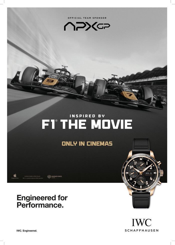 영화에서 IWC 샤프하우젠은 가상의 F1® 팀 APXGP의 공식 팀 워치 브랜드로 등장하며, 레이스카, 드라이버 슈트, 헬멧, 피트 구조물 등 다양한 소품과 장면을 통해 IWC 로고를 자연스럽게 노출한다. 이를 통해 IWC는 영화의 리얼리티를 더하는 동시에, 브랜드의 모터스포츠 헤리티지와 엔지니어링 기술력을 효과적으로 전달한다.