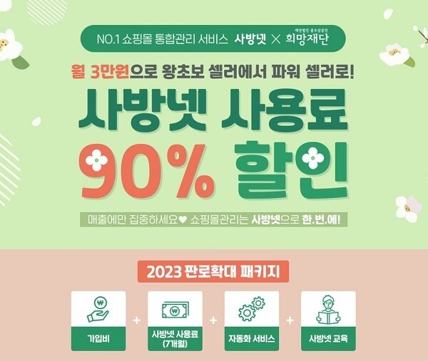‘2023년 판로확대 패키지’는 온라인 판매가 익숙하지 않은 소상공인을 대상으로 쇼핑몰 통합관리 서비스 ‘사방넷’을 지원해 안정적으로 온라인 시장에 진출하고 매출을 성장시킬 수 있도록 지원하는 사업이다.