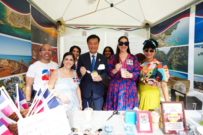서울 성북구는 지난 21일 성북구청 바람마당에서 열린 ‘제12회 라틴아메리카 축제’를 성공적으로 마무리했다. 이번 축제에는 남미의 매력을 느낄 수 있는 다양한 판매 및 체험 부스가 운영됐다. 사진은 이승로 구청장(가운데)이 도미니카공화국 부스를 방문해 기념촬영을 하고 있는 모습. (사진=성북구청 제공)