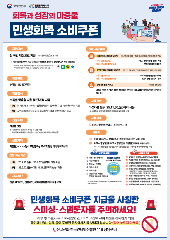 [인천=문찬식 기자] 인천 서구(구청장 강범석)는 오는 21일 민생회복 소비쿠폰 1차 신청 접수에 앞서 불분명한 인터넷 주소(URL, 링크 등)가 담긴 문자(스미싱)를 특히 주의해야 한다고 16일 당부했다.
