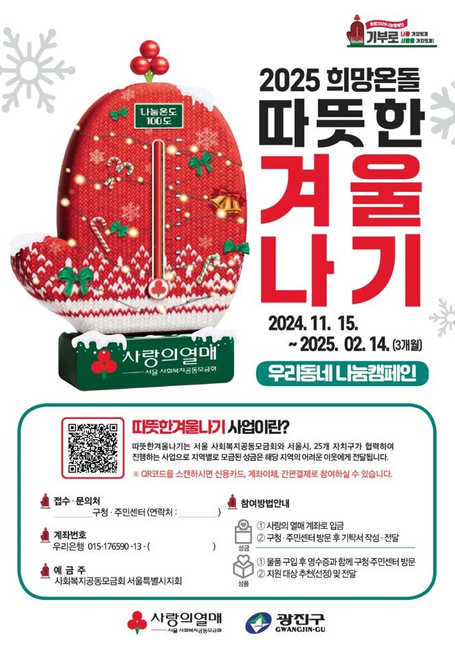 [시민일보 = 여영준 기자] 광진구(구청장 김경호)가 내년 2월14일까지 나눔 문화 확산을 위한 ‘2025 희망온돌 따뜻한 겨울나기’ 캠페인을 진행한다.