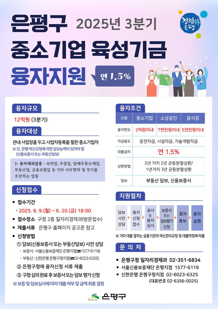 신청접수는 오는 9~20일 오후 6시까지, 총 2주간 진행된다. 신청을 원하는 기업은 사전에 서울신용보증재단 은평지점 또는 신한은행 은평구청지점에서 보증서 및 담보 상담을 받은 후, 은평구청 일자리경제과를 직접 방문해 신청서를 제출해야 한다. 제출 서류는 은평구청 누리집 공고문을 통해 확인하면 된다.