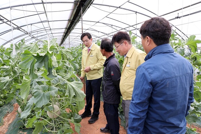 | ▲ 우승희 영암군수가 지난 21일 도포면 멜론 재배 현장을 찾아 멜론 작황 등을 점검하며 재배 농민의 애로사항을 청취하고 있다. / 영암군 제공 |