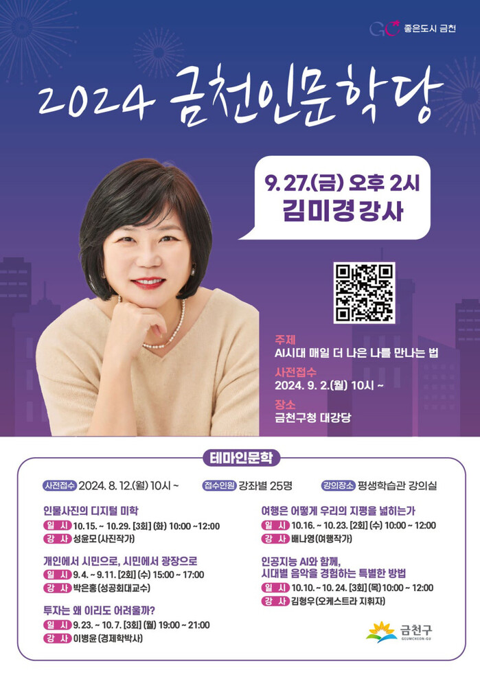 [시민일보 = 여영준 기자] 서울 금천구(구청장 유성훈)는 27일 오후 2시 구청 대강당에서 김미경 강사를 초청해 ‘금천인문학당’ 명사 초청 특강을 운영한다고 밝혔다.