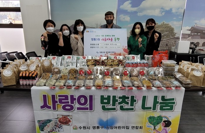 경기 수원시 영통구 가정어린이집연합회는 어버이날을 맞아 지난 6일 영통3동 홀몸노인 20가구를 대상으로 어린이집 원장들이 손수 만든 음식과 함께 카네이션을 준비해 ‘사랑의 카네이션과 함께 반찬나눔’ 행사를 진행헸다. 사진은 전달식에서 관계자들이 기념촬영을 하는 모습. (사진제공=영통구청)