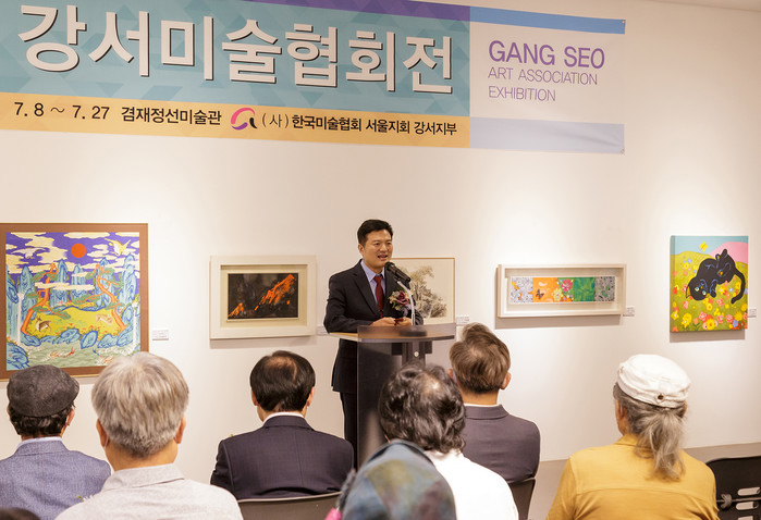 김태우 서울 강서구청장은 최근 겸재정선미술관에서 열린 ‘제23회 강서미술협회전 개막식’에 참석해 지역 문화예술인들을 만나 소통했다. 개막식은 강서미술협회장 환영사, 내빈축사, 테이프 커팅식 등 순으로 진행됐다. 사진은 개막식에서 김 구청장이 인사말을 하고 있는 모습. (사진제공=강서구청)