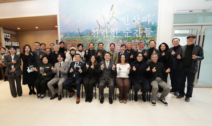 오승록 서울 노원구청장이 최근 노원문화예술회관 노원아트뮤지엄에서 열린 ‘인상파, 찬란한 순간들: 모네, 르누아르, 반 고흐 그리고 세잔’ 전시 개막식 행사에 참석해 개막을 함께 축하했다. 사진은 오 구청장(앞줄 오른쪽 네 번째)이 참석자들과 기념 촬영을 하는 모습. (사진=노원구청 제공)