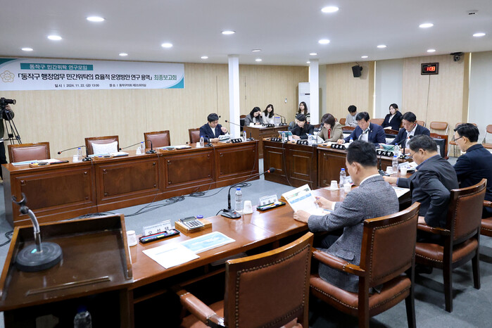 [시민일보 = 여영준 기자] 서울 동작구의회(의장 정재천) 의원 연구단체 ‘동작구 민간위탁 사업 연구모임’은 지난 22일 구의회 제2소회의실에서 ‘동작구 행정업무 민간위탁의 효율적 운영방안 연구 용역’ 최종보고회를 개최했다.