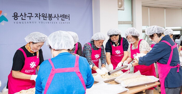 박희영 서울 용산구청장은 지난 22일 용산구자원봉사센터에서 열린 ‘추석맞이 강정(情)나눔’ 행사에 참석해 자원봉사자들과 정성껏 쌀강정을 빚어 지역내 경로당 93곳에 전달했다. 사진은 박희영 구청장과 자원봉사자들이 쌀강정을 빚고있는 모습. (사진=용산구청 제공)
