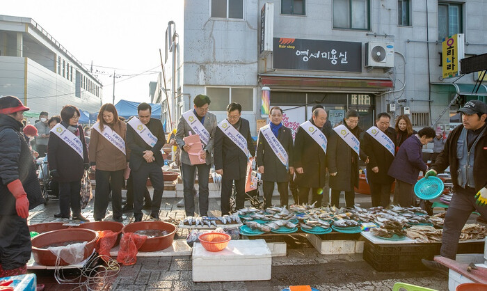 | ▲ 이성옥 해남군의회 의장(오른 쪽부터 세 번째)이 동료의원 등과 21일 오전 민족 대명절 설을 맞아 해남읍 5일 전통 시장을 찾아 수산물장보기를 하고 있다. / 해남군의회 제공 |