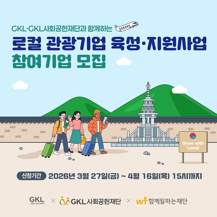 GKL(그랜드코리아레저), GKL사회공헌재단, 함께일하는재단이 지역 관광 활성화를 위해 전문 기업을 발굴하는 ‘2026 로컬 관광기업 육성·지원 사업’ 참가사를 오는 4월 16일까지 모집한다.