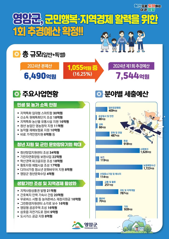 지난 4월30일 영암군의회 의결로 확정된 제1회 추경은 올해 본예산 대비 16.25% 1055억원이 증액된 규모로, 일반회계는 15.49% 914억원 증가한 6815억원, 특별회계는 23.89% 140억원 증가한 729억원이다.