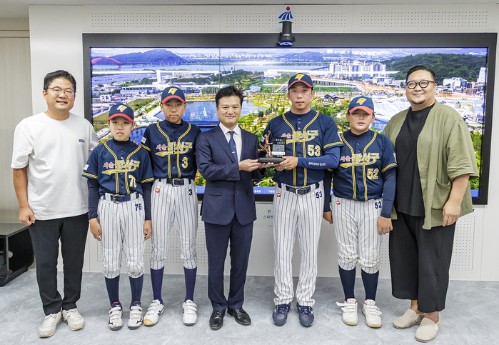 서울 강서구가 최근 강서리틀야구단 학부모회로부터 유소년 야구단 육성지원에 따른 감사의 표시로 감사패를 전달받았다. 사진은 전달식에서 김태우 구청장(가운데)과 리틀야구단 관계자들이 기념촬영을 하고 있는 모습. (사진제공=강서구청)