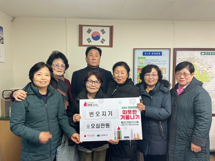 [시민일보 = 홍덕표 기자] 서울 강북구(구청장 이순희) 번2동이 최근 사회봉사단체 번오지기에서 어려운 이웃을 위해 써달라며 성금 50만원을 전달했다고 8일 밝혔다.