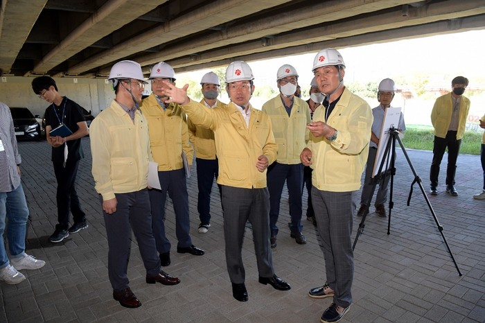 [광주=정찬남 기자] 문영훈 광주광역시 행정부시장(가운데)이 27일 오후 국가안전대진단 현장인 광산구 광신대교를 방문해 관계자로부터 시설물 현황을 보고 받은 후 안전점검을 하고 있다./광주광역시 제공