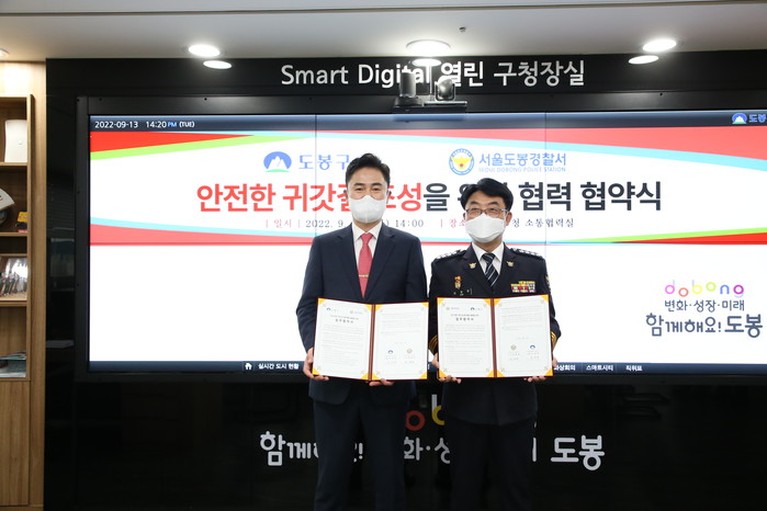 서울 도봉구는 최근 도봉경찰서와 ‘안전한 귀갓길 조성을 위한 업무협약’을 맺었다. 양 기관은 범죄 취약계층에 대한 범죄 피해를 예방하는 데 협력하기로 했다. 사진은 오언석 구청장(왼쪽)과 도봉경찰서장이 기념촬영을 하는 모습. (사진제공=도봉구청)