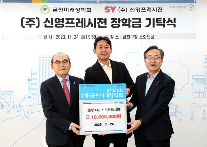 (재)금천미래장학회는 최근 (주)신영프레시젼으로부터 지난해에 이어 올해에도 장학금 1000만원을 기탁받았다. 사진은 유성훈 구청장(오른쪽)이 박준식 금천미래장학회 이사장, 신영주 대표와 기념촬영을 하고 있는 모습. (사진=금천구청 제공)