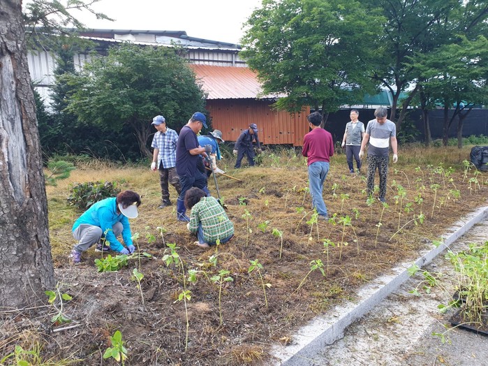 경기 포천시 관인면 주민자치위원회는 4일 주민자치센터 유휴부지 일원에 ‘2022년 관인문화마을 해·바라기 투어코스 조성사업’과 연계해 주민 개방형 정원 조성을 위해 해바라기 500주를 식재했다. 사진은 이날 주민자치위원들이 해바라기를 심고 있는 모습. (사진제공=포천시청)