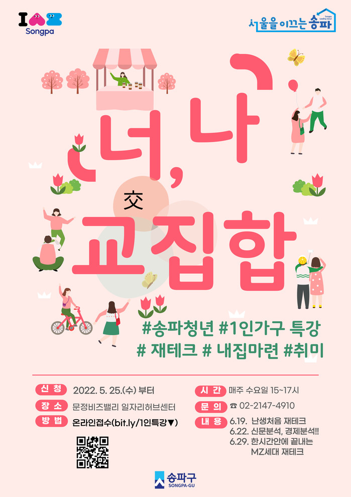 [시민일보 = 이대우 기자] 송파구가 지역내 거주하는 청년 1인 가구를 대상으로 특강 <너, 나 교집합>을 운영, 오는 25일부터 선착순 접수한다고 밝혔다.