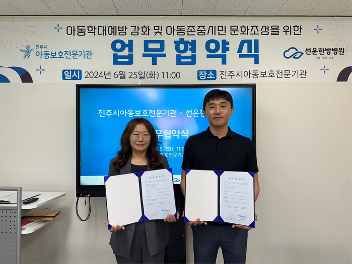 진주시아동보호전문기관(관장 김혜진)과 선운한방병원(병원장 정문수)은 지난 25일 ‘아동학대예방강화와 아동존중시민문화 조성’을 위한 업무협약을 체결했다.