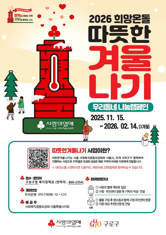 [시민일보 = 박소진 기자] 서울 구로구(구청장 장인홍)가 오는 15일부터 내년 2월14일까지 ‘2026 희망온돌 따뜻한 겨울나기’ 사업을 시작한다.
