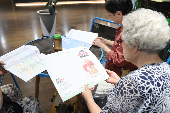 | ▲ 노인들이 '성동구 어르신 생활안내서'를 살펴보는 모습. (사진=성동구청 제공) |