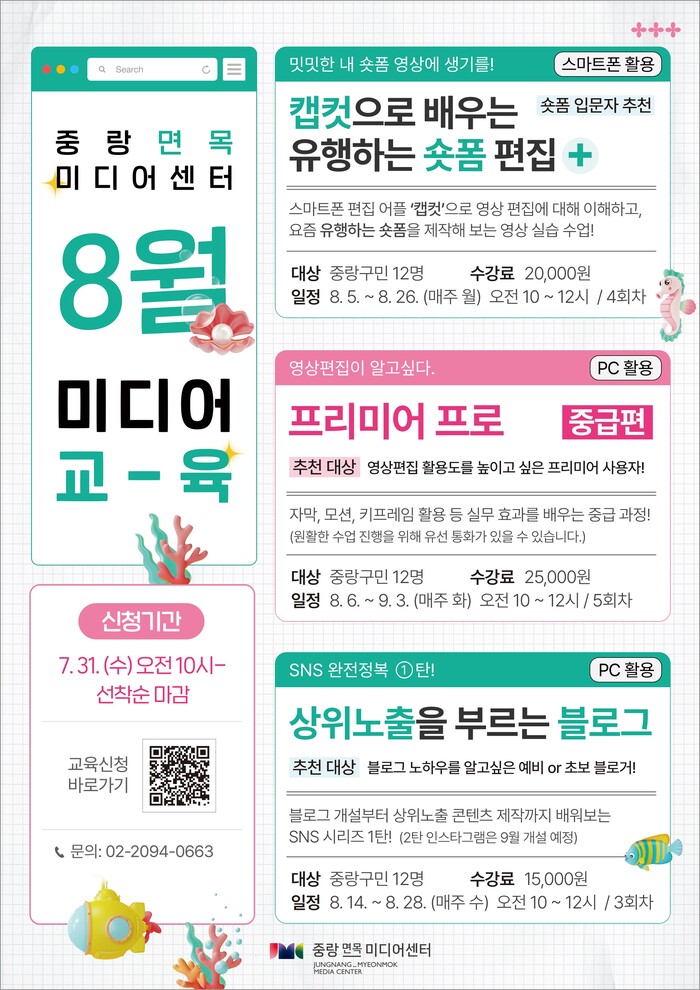 | ▲ 중랑면목미디어센터 8월 교육 포스터 (사진=중랑구청 제공) |
