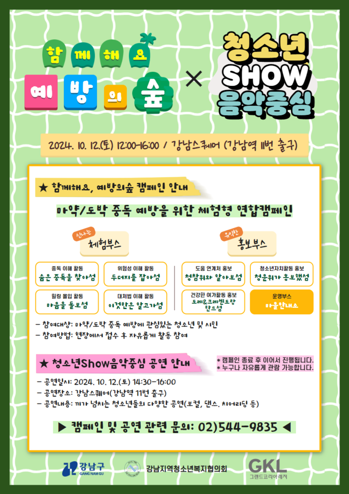 ‘청소년 SHOW 음악중심’은 청소년 동아리 8개 팀이 참여해 노래, 댄스, 치어리딩, 국악 등의 공연을 펼친다. 특히, 강남구 친선도시인 의정부시가 참여해, 두 도시의 청소년들이 서로 교류하고 우정을 나누는 자리가 될 것으로 기대된다. 또한, 지난 9월 청소년들을 대상으로 진행한 ‘중독예방’ 4행시 공모전 시상식이 이날 무대에서 열린다. 재기발랄한 4행시 우수작은 이날 전시회에서 관람할 수 있다.