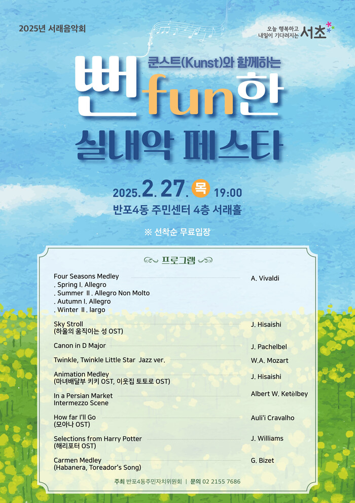 약 1시간 진행되는 ‘쿤스트와 함께하는 뻔fun한 실내악 페스타’는 선착순 무료입장으로 음악을 좋아하는 누구나 관람할 수 있다. 자세한 사항은 반포4동 주민센터로 문의하면 된다.