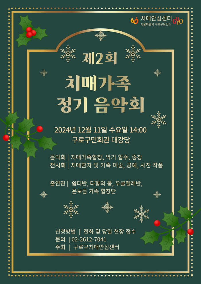 해당 음악회는 구로구보건소와 구로구치매안심센터가 주최하는 행사로 치매노인과 그 가족을 위로하고 치매에 대한 사회적 인식을 개선하는 데 도움을 주고자 2023년부터 개최되기 시작했다.