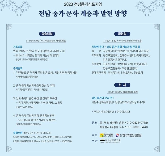 전라남도(도지사 김영록)가 지난 20일 광주광역시에 소재한 국립아시아문화전당에서 ‘2023 제7회 전남 종가 심포지엄’을 개최했다.