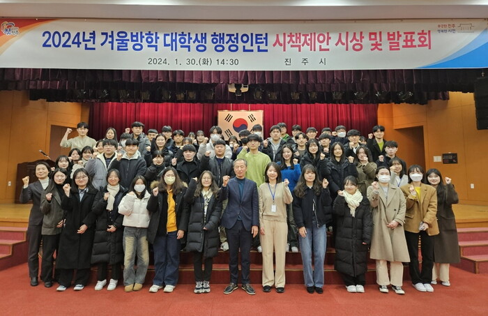 진주시는 30일 시청 시민홀에서 2024년 겨울방학 행정인턴사업에 참여한 학생 60명을 대상으로 실시한 ‘대학생 행정인턴 우수시책 제안자 시상식 및 발표회’를 개최했다.