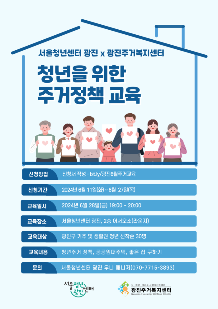 [시민일보 = 여영준 기자] 서울 광진구(구청장 김경호)는 오는 28일 오후 7시, 서울청년센터 광진에서 부동산 지식이 부족한 청년에게 도움을 주고자 ‘청년을 위한 주거교육’을 실시한다고 밝혔다.