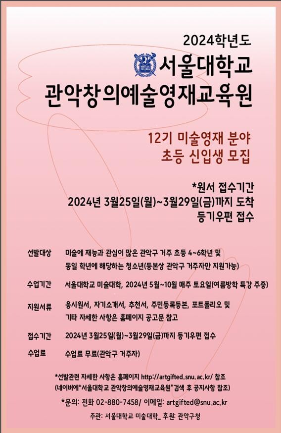 자세한 사항은 서울대학교 관악창의예술영재교육원과 관악구 교육지원과로 문의하면 된다.