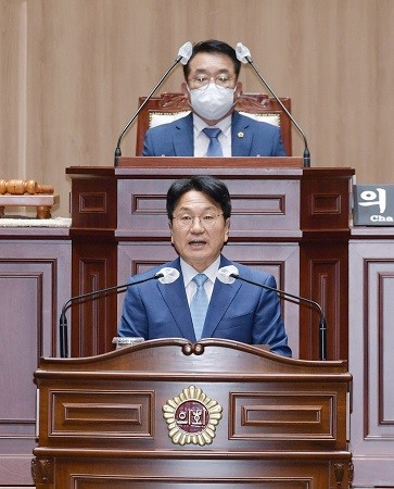 [광주=정찬남 기자] 강기정 광주광역시장이 11일 오후 광주광역시의회 본회의장에서 열린 '제9대 시의회 개원식'에 참석해 축사를 하고 있다./광주광역시 제공