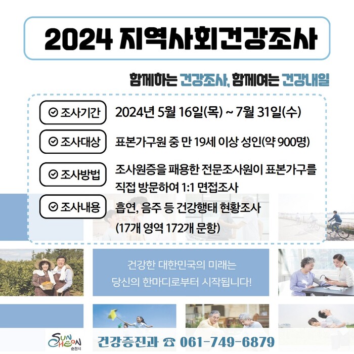 조사 내용은 건강행태(흡연ㆍ음주 등), 걷기실천율, 이환 및 의료이용 등 17개 영역 172개 항목의 건강지표가 조사되며, 지표를 분석해 시민들에게 맞춤형 지역사회 통합건강증진사업을 수행한다.