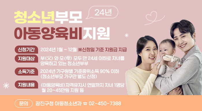 [시민일보 = 여영준 기자] 서울 광진구(구청장 김경호)는 청소년 부모의 경제적 부담을 덜기 위해 자녀당 월 20만~45만원씩 아동 양육비를 확대 지원한다고 밝혔다.