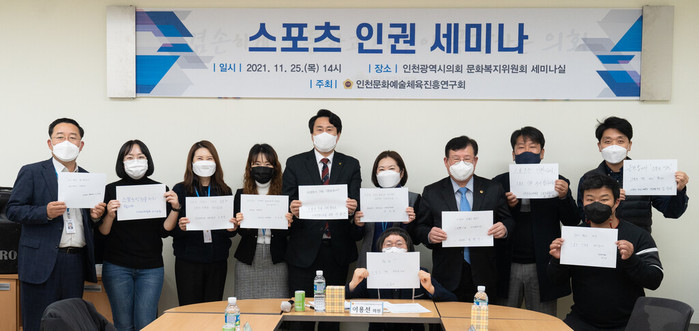 [인천=문찬식 기자] 인천시의회 의원연구단체 ‘인천문화예술체육진흥연구회’가 최근 문화복지위원회 세미나실에서 ‘스포츠 인권’을 주제로 세미나를 개최했다.